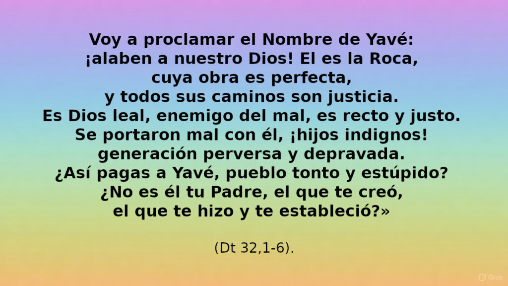 «Voy a proclamar el Nombre de Yavé: ¡alaben a nuestro Dios! El es la Roca, cuya obra es perfecta, y todos sus caminos son justicia. Es Dios leal, enemigo del mal, es recto y justo. Se portaron mal con él, ¡hijos indignos! generación perversa y depravada. ¿Así pagas a Yavé, pueblo tonto y estúpido? ¿No es él tu Padre, el que te creó, el que te hizo y te estableció?» (Dt 32,3-6).